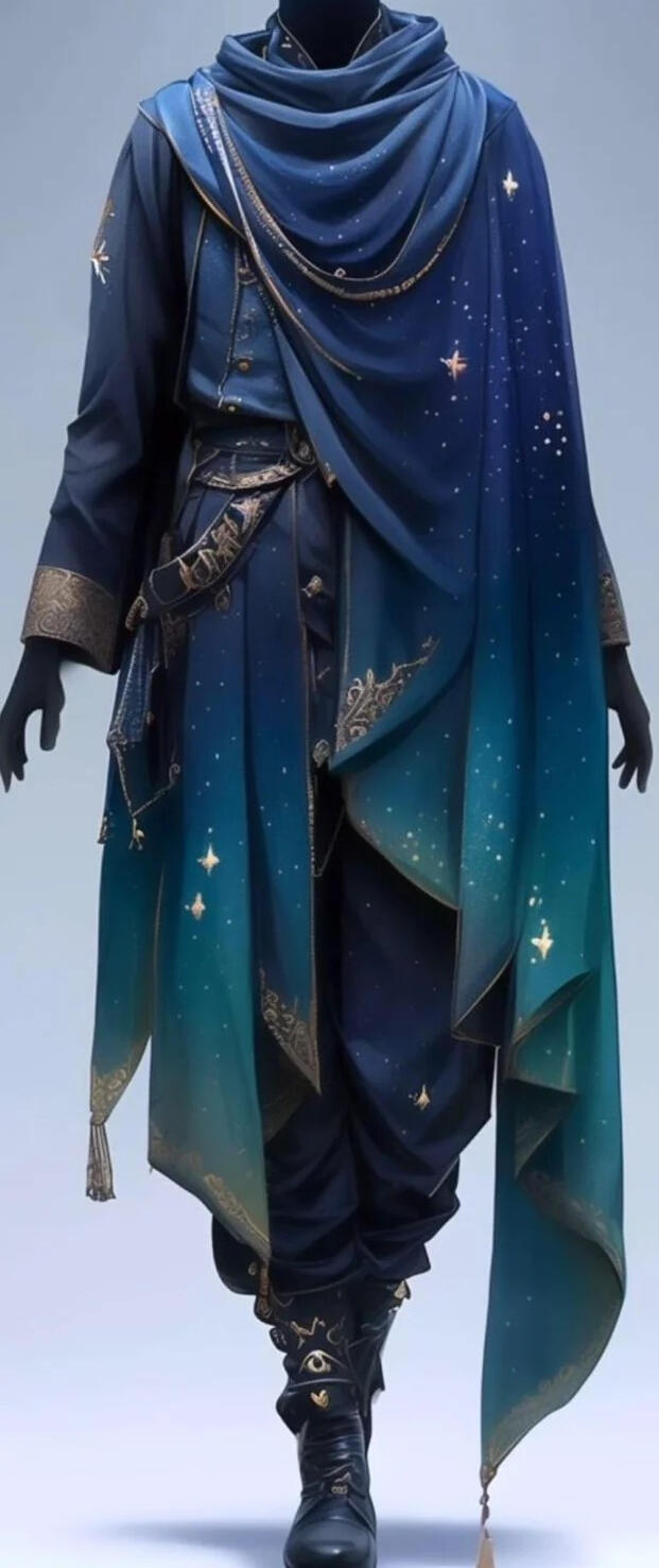 Wygląd: Błękitny płaszcz bez kaptura, zdobiony złotymi nićmi, którego poły zdobią naszycia w kształcie gwiazd, upodabniając go do nocnego nieba. Jego barwa różni się w zależności od miejsca i kąta padania światła, przez co materiał wydaje się raz ciemniejszy, a raz jaśniejszy, dając niekiedy wrażenie falowania. Osobliwy krój z wielu większych, zszytych ze sobą płacht materiału sprawia, że dodaje on noszącemu unikatowego, egzotycznego klimatu. Całość kiepsko chroni przed zimnem, pomimo wielu warstw, ubiór ten wydaje się nad wyraz cienki i przewiewny.
