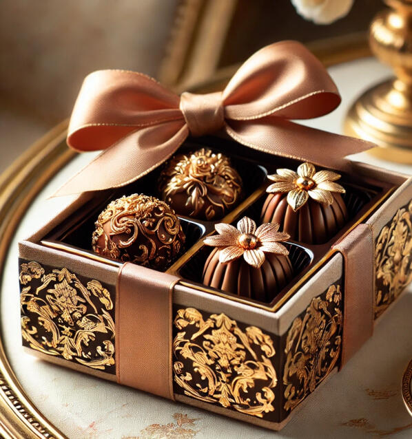 Wygląd: Pudełko czekoladek jakże niepozorne, a mimo to przyciągające uwagę. Chociaż jego rozmiar pozostawia wiele do życzenia, zdobienia pozwalają na docenienie jego formy. Brąz pudełka komponuje się ze wzorami w kolorze złota, a kremowa wstążka przechodząca w odcienie różu idealnie dopełnia zachowaną estetykę.